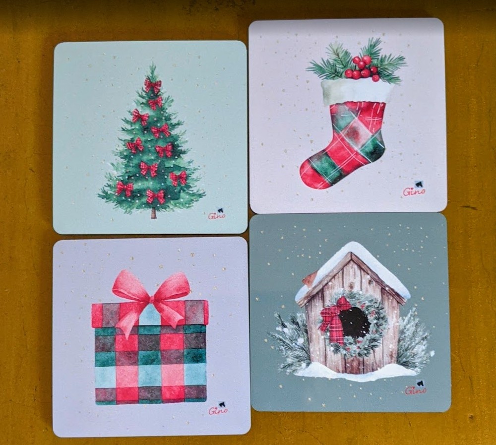 Set of 4 beautiful Christmas coasters, featuring a Christmas Tree, a Stocking, a Present and a decorated Kennel. Made of durable Melamine with a hard backing.
