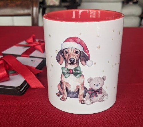 White, textured cotton fabric cushion cover with appliqué featuring two adorable dogs, very much in the Christmas spirit! Black, silk-blend frill and contrast stitching. Filling not included. Standard size. Pair. DRY CLEAN ONLY